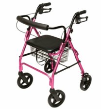 Lightweight 4 wheeled Rollator folds for easy storage. Leather padded seat with basket underneath for storage Weighs only 14.5lbs Std Height of 22" seat to floor. Also available in adj ht.